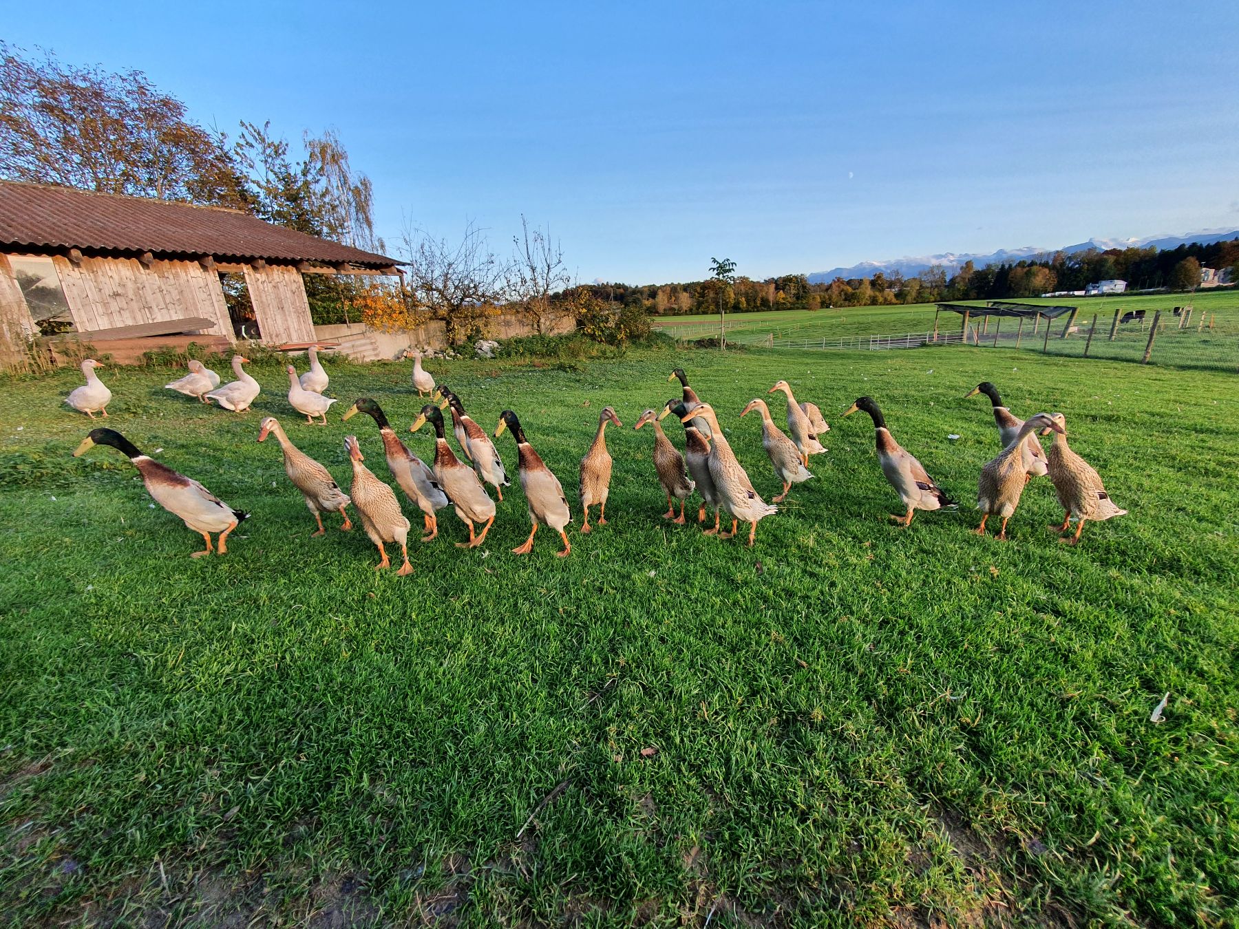 Seit bald 30 jahren leben auf unserem Hof Laufenten, momentan im Farbschlag forellenfarbig. Diese auch Flaschenente genannte Entenart fällt besonders durch die aufgerichtete Haltung auf.
